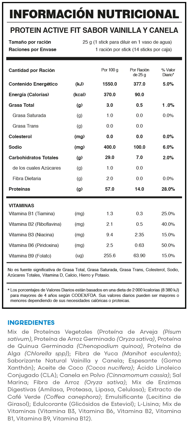 Bioprotein Active (Proteína de Quinua Germinada, de Arveja, de Arroz Germinado y de Algas) + Aminoácidos Esenciales + L-Carnitina + Tamarindo Malabar + Vitaminas + Calcio + Cromo y Zinc en Molécula Orgnanica.